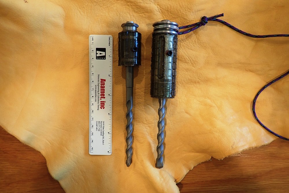 The type of drill holder that I make these days is called the bombproof because I tried to develop a holder that would last nearly forever. It is made from a high strength 7/8" bolt. Not only is the steel high strength, it is extremely tough which is apparent when I try to machine it. The bit is held in place by two set screws so one tool, an Allen wrench, is required to change bits. The grip is Shore 60A urethane that is cast in place and cannot be removed. It has an extremely hard steel striking surface - harder than the hammers. The socket is about 2.7 inches deep. I know of bombproof holder that have placed hundreds of bolts and are still going strong. I have several bombproof holders available.